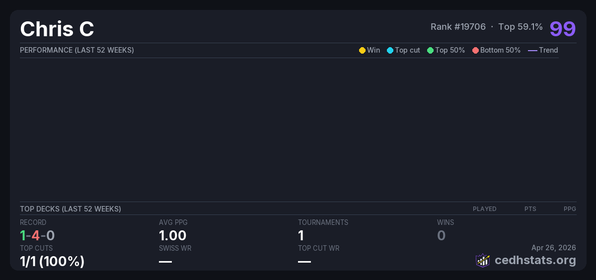 | CEDH Proxy Friendly Hive Tournament Nov 30, 2025 · 20 players | 9/20 | 1-4-0 | 1.00 | 99 |