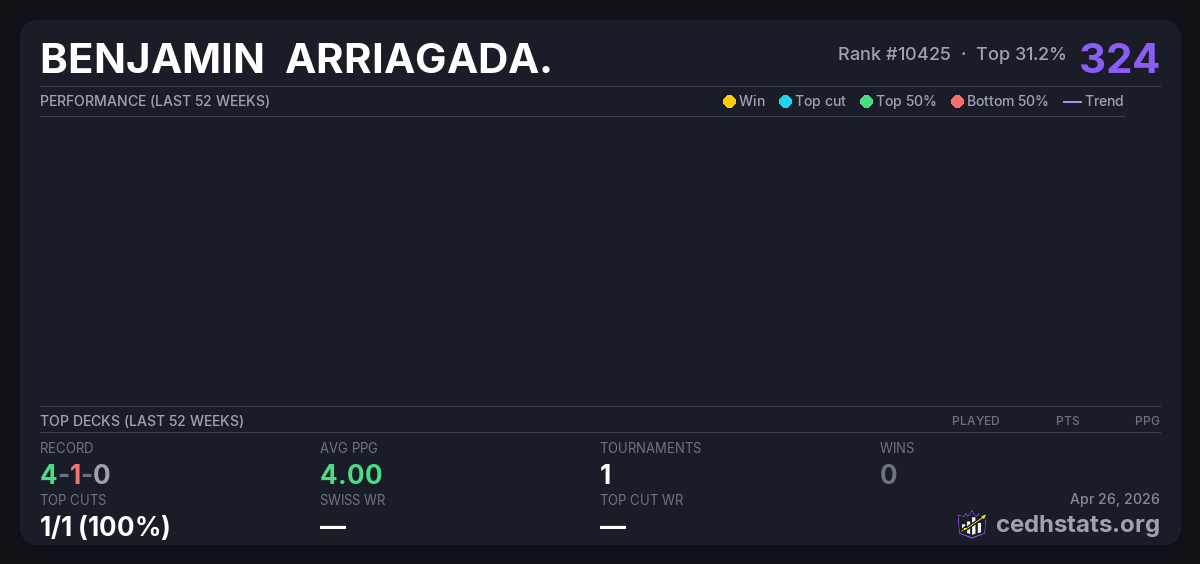 | CEDH HAMMER TCG STORE Sep 27, 2025 · 20 players | Invalid pairing | 2/20 | 4-1-0 | 4.00 | 324 |
