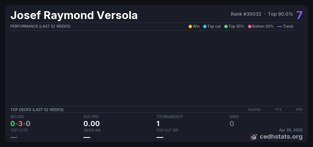 | $100 Commander Multi Jul 13, 2025 · 18 players | Invalid pairing | 16/18 | 0-3-0 | 0.00 | 7 |