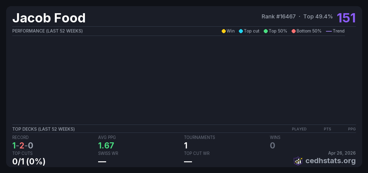 | August Invitational Qualifier Aug 30, 2025 · 18 players | — | 5/18 | 1-2-0 | 1.67 | 151 |
