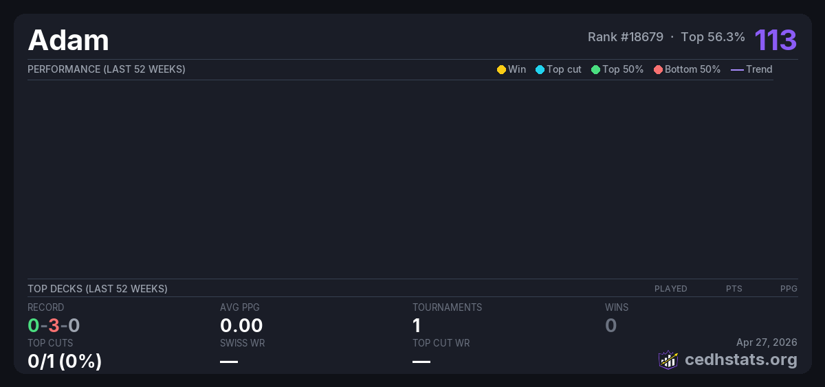| January Invitational Qualifier Jan 24, 2026 · 28 players | 11/28 | 0-3-0 | 0.00 | 113 |