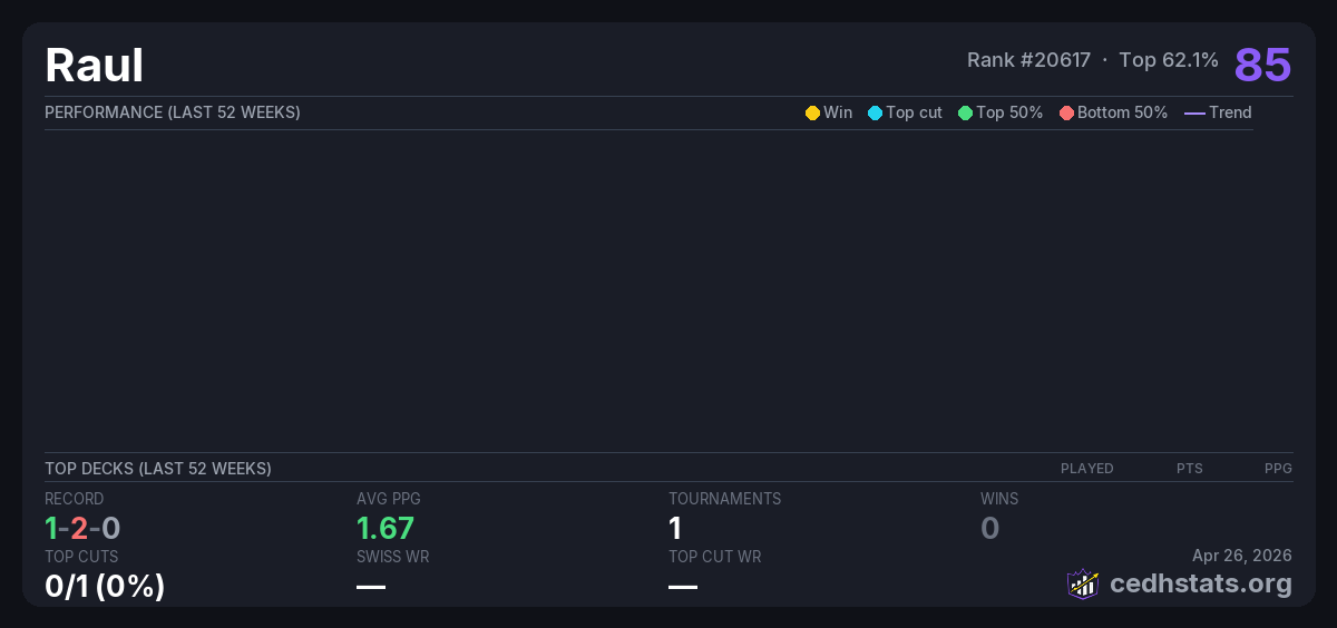 | Tournament | Deck | Result | Record | PPG | Points ? |