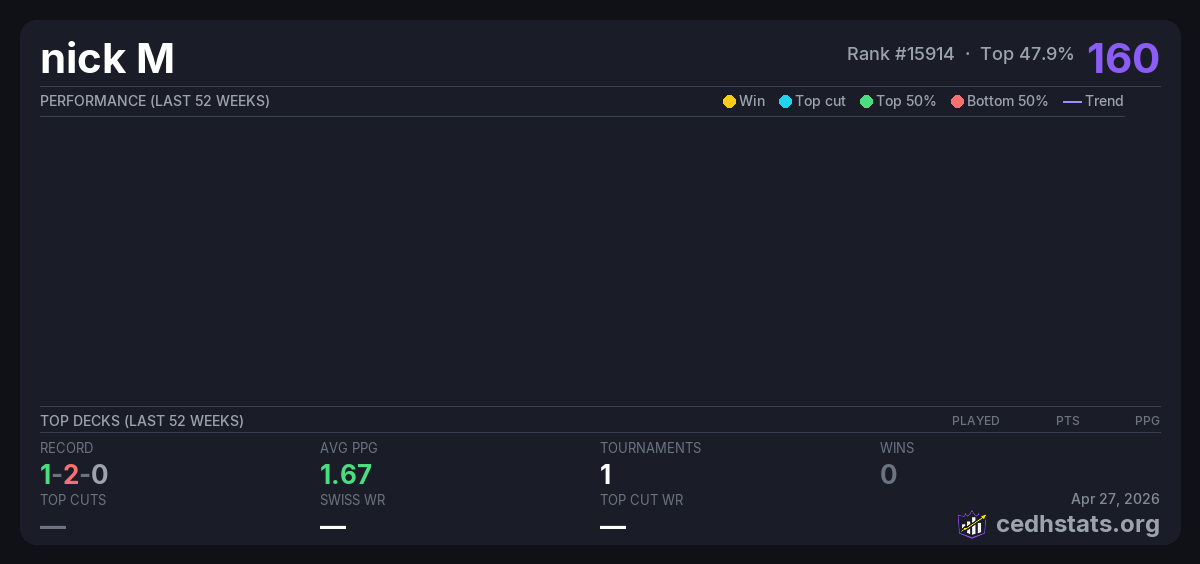| FNM EDH 11-21-25 Nov 21, 2025 · 28 players | Invalid pairing | 8/28 | 1-2-0 | 1.67 | 160 |