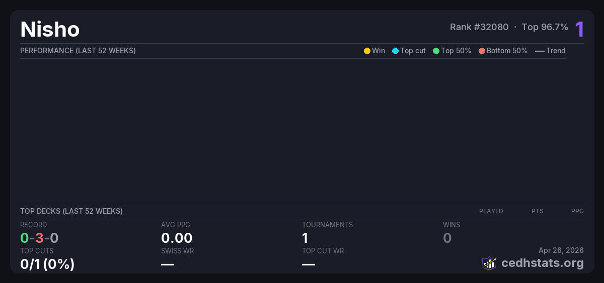 | 2nd 8Pocho Cup Jul 05, 2025 · 16 players | Invalid pairing | 16/16 | 0-3-0 | 0.00 | 1 |
