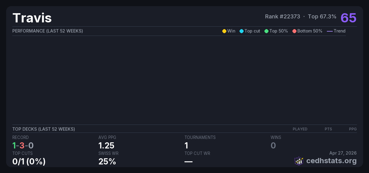 | Paragon Gaming April 25th Precon Tournament Apr 25, 2026 · 16 players | — | 8/16 | 1-3-0 | 1.25 | 65 |
