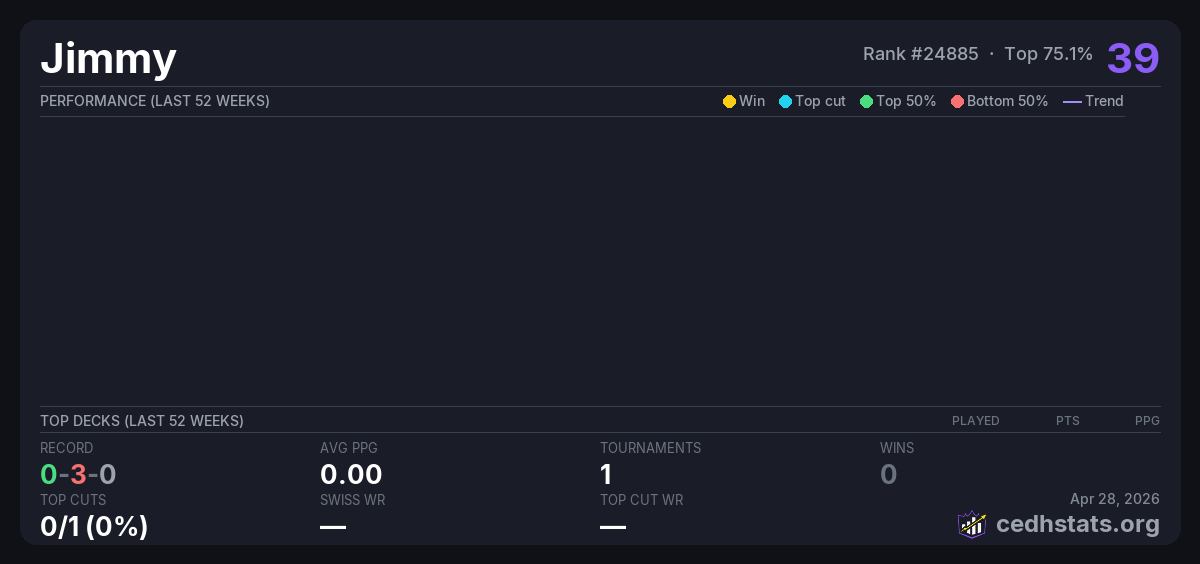 | Thirsty Thursday Dec 12, 2025 · 18 players | 12/18 | 0-3-0 | 0.00 | 39 |