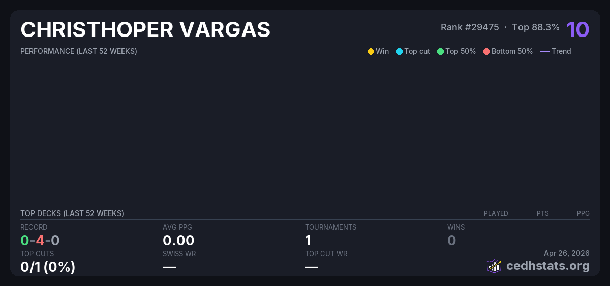 | CEDH HAMMER TCG STORE Sep 27, 2025 · 20 players | Invalid pairing | 17/20 | 0-4-0 | 0.00 | 10 |