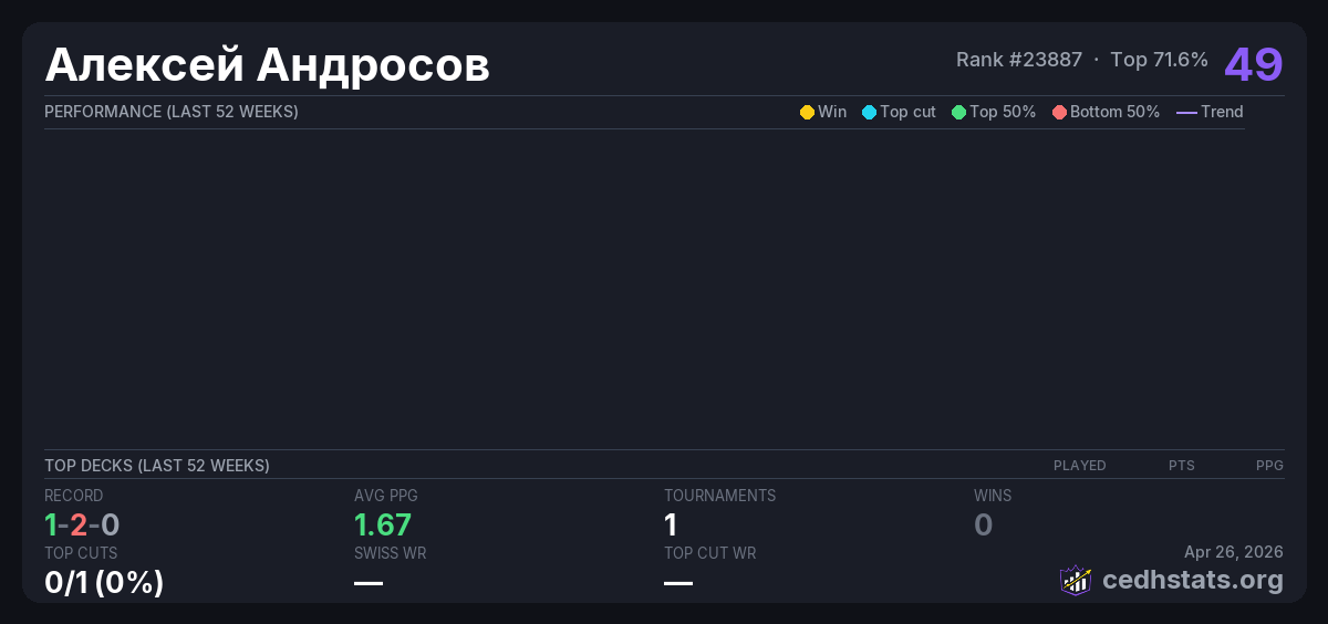 | Tournament | Deck | Result | Record | PPG | Points ? |