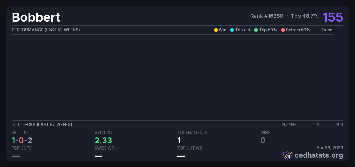 | Commander League week 1 Jan 31, 2026 · 19 players | 5/19 | 1-0-2 | 2.33 | 155 |