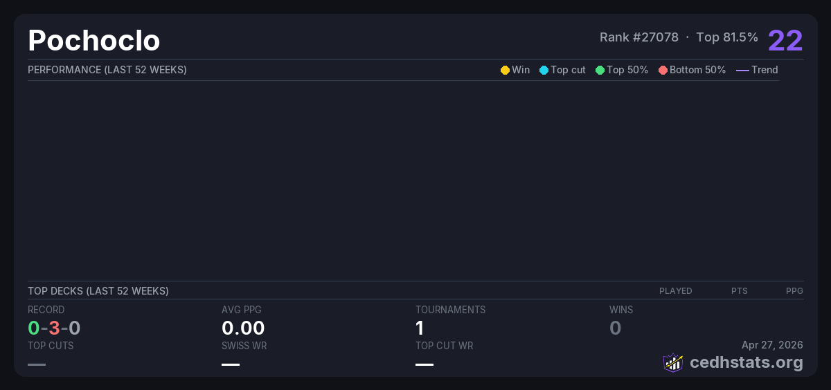 | COMMANDER - LA CONQUISTA DE LOS CHUPAS / VICUÑA Aug 30, 2025 · 16 players | Invalid pairing | 12/16 | 0-3-0 | 0.00 | 22 |
