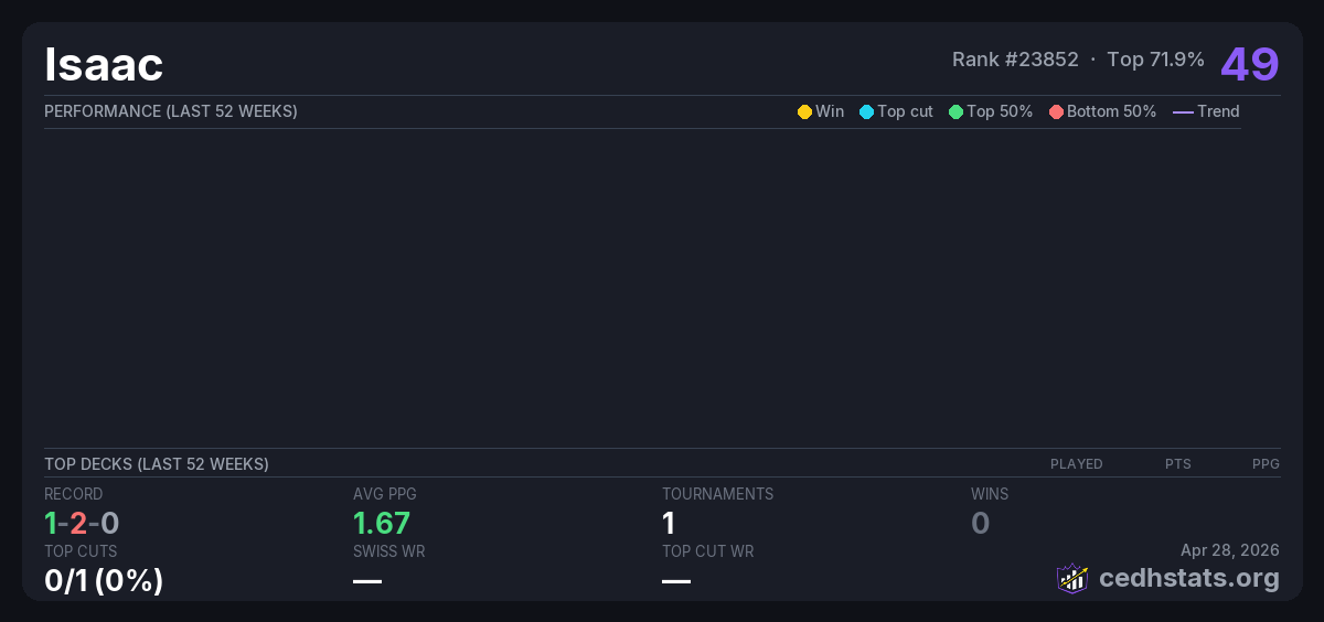 | CommandFest Aug 31, 2025 · 21 players | Invalid pairing | 13/21 | 1-2-0 | 1.67 | 49 |