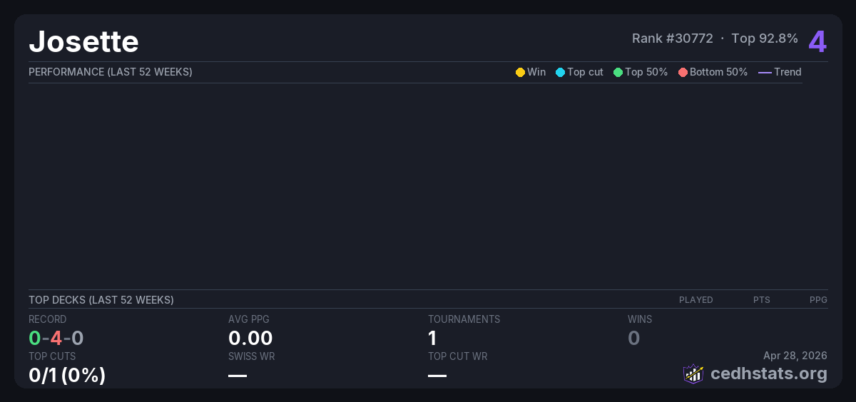 | Bracket 4 Tournament Nov 09, 2025 · 25 players | Invalid pairing | 23/25 | 0-4-0 | 0.00 | 4 |