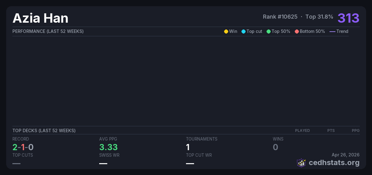 | Tournament | Deck | Result | Record | PPG | Points ? |