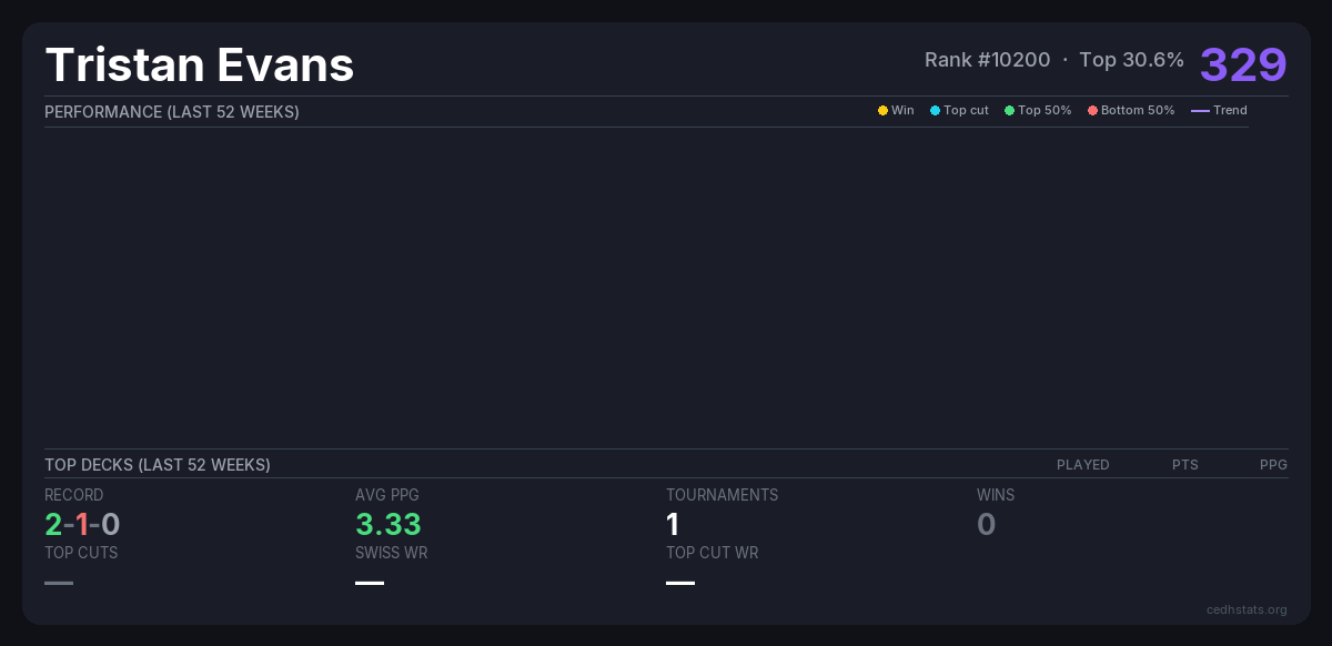 | Bracket 3 Mar 29, 2026 · 22 players | 2/22 | 2-1-0 | 3.33 | 329 |