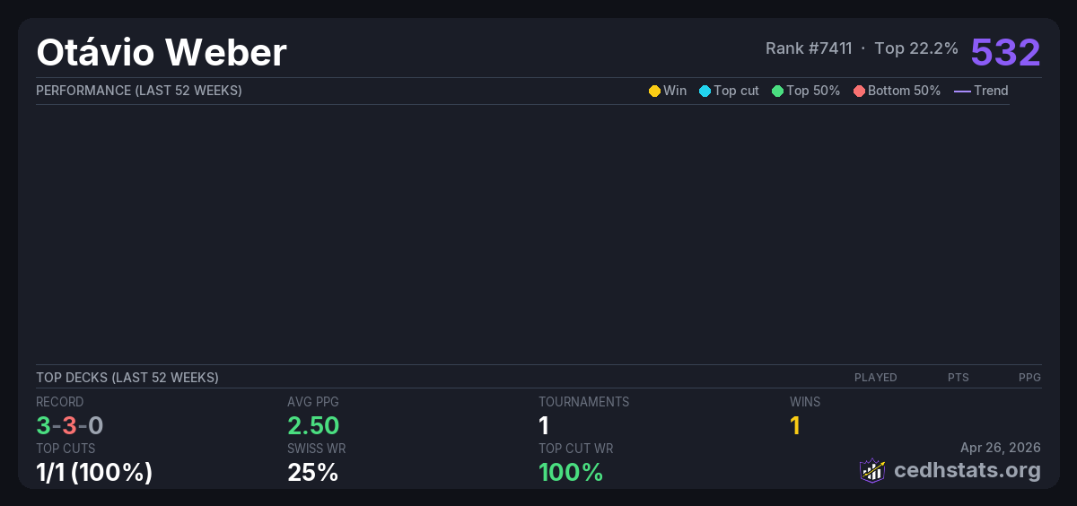 | Commander 500 - 2K - 25-04-2026 Apr 25, 2026 · 24 players | — | 1/24 | 3-3-0 | 2.50 | 532 |