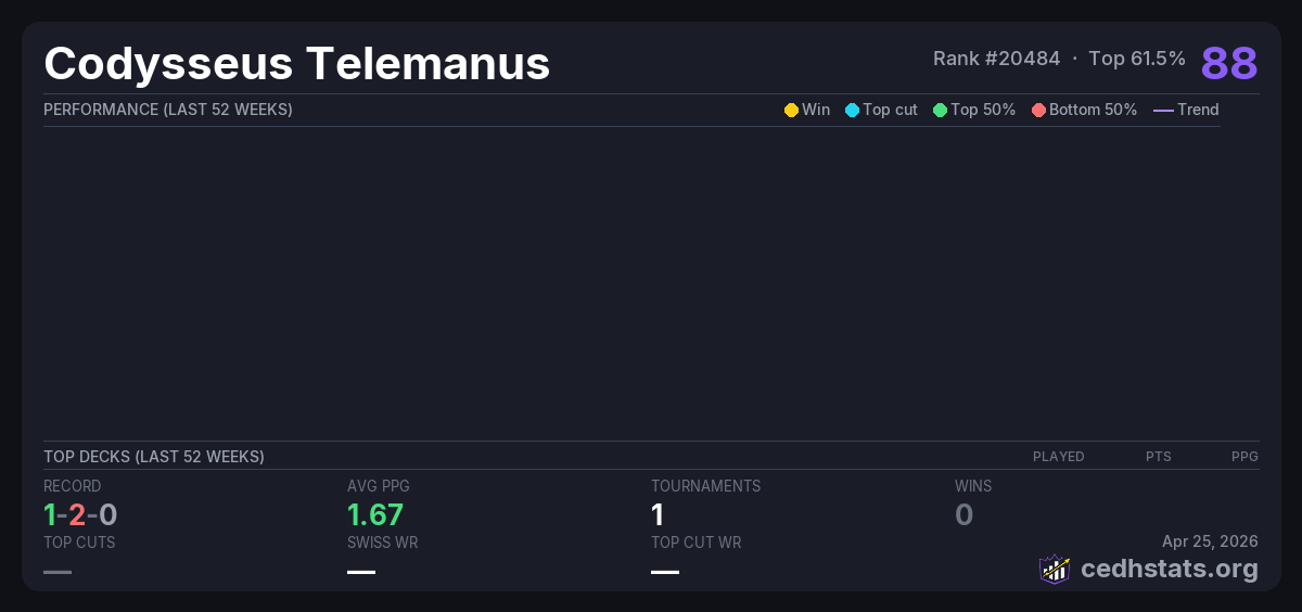 | FNM EDH 10-24-25 Oct 24, 2025 · 23 players | Invalid pairing | 11/23 | 1-2-0 | 1.67 | 88 |