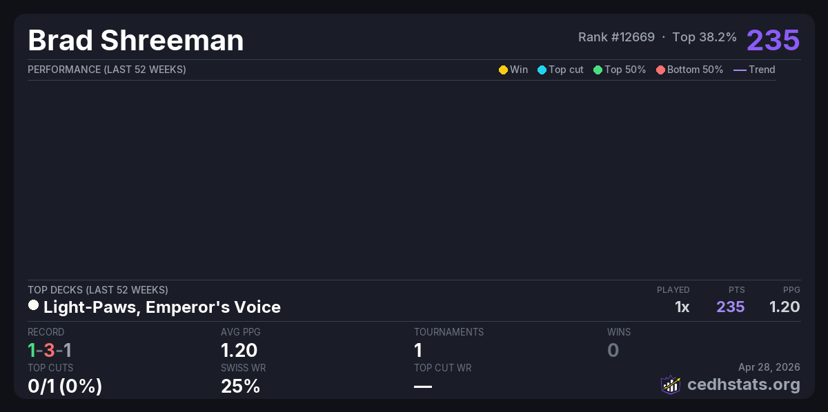 | Shuffle N Roll's cEDH Dual Land Tournament Apr 25, 2026 | Light-Paws, Emperor's Voice | 21/52 | 1-3-1 | 235 |