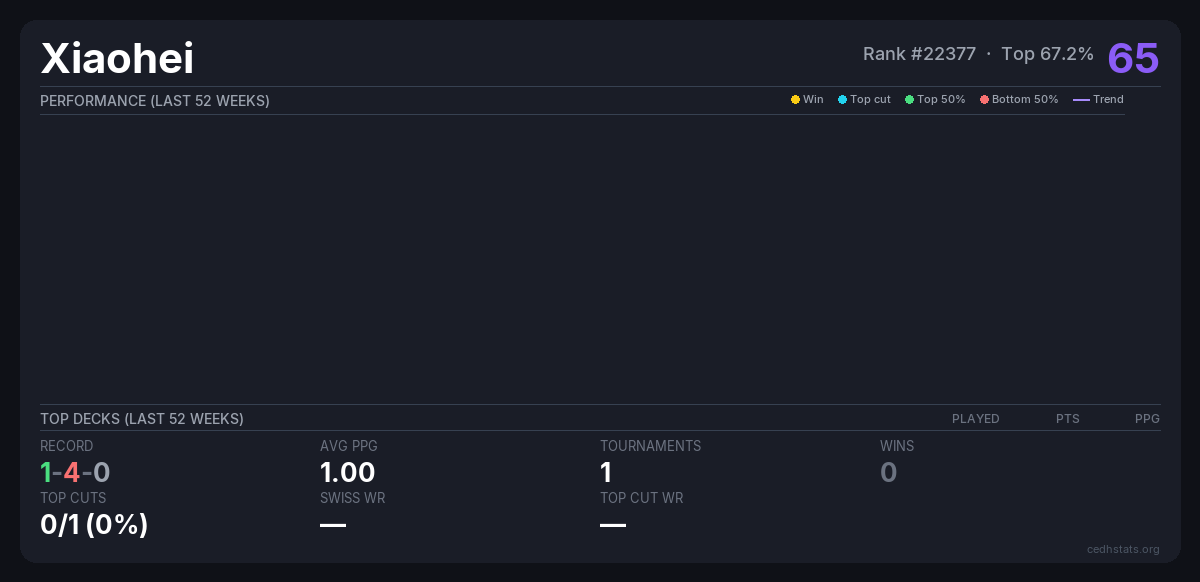 | 2025.10.25 广州CF cEDH Oct 25, 2025 · 80 players | Invalid pairing | 48/80 | 1-4-0 | 1.00 | 65 |
