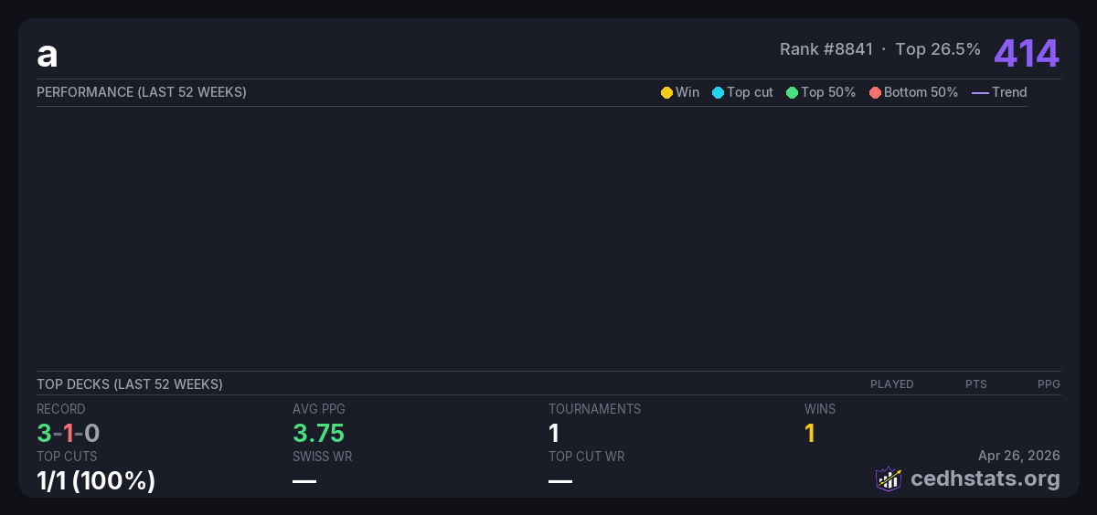 | Tournament | Deck | Result | Record | PPG | Points ? |