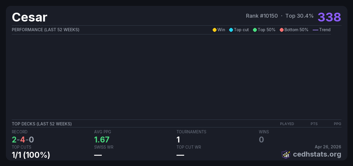 | Tournament | Deck | Result | Record | PPG | Points ? |