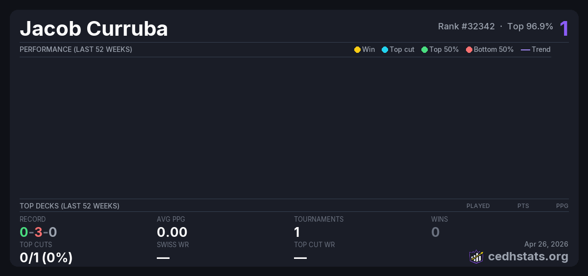 | FNM Magic Sep 05, 2025 · 16 players | — | 16/16 | 0-3-0 | 0.00 | 1 |