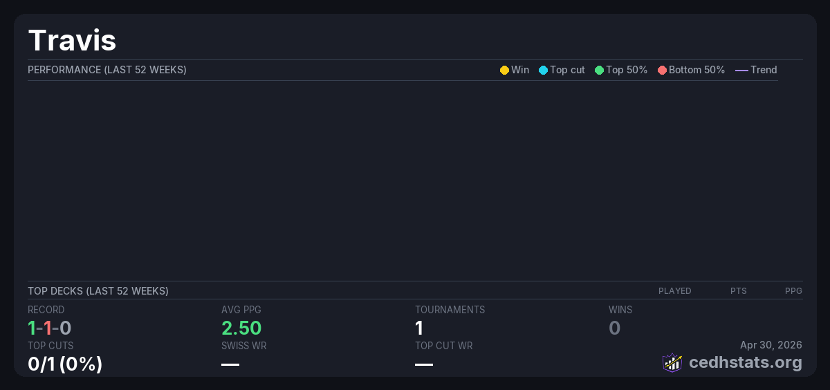 | Casual Commander :) Mar 21, 2026 · 17 players | 6/17 | 1-1-0 | 2.50 | โ |