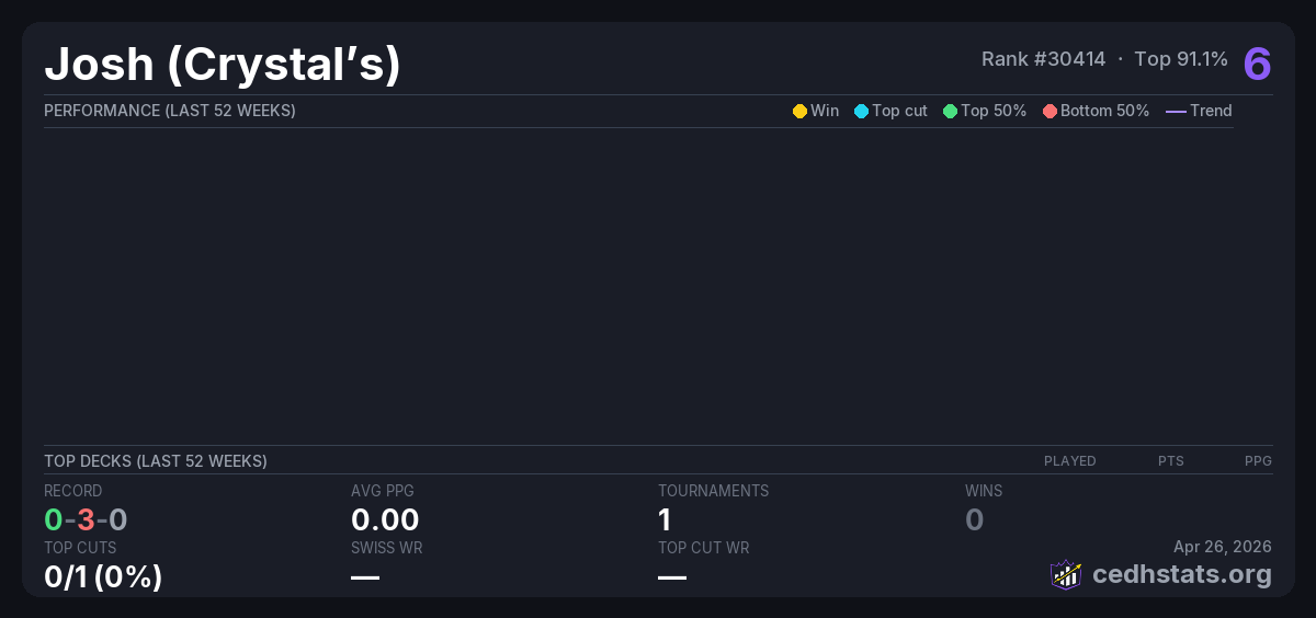 | Tournament | Deck | Result | Record | PPG | Points ? |
