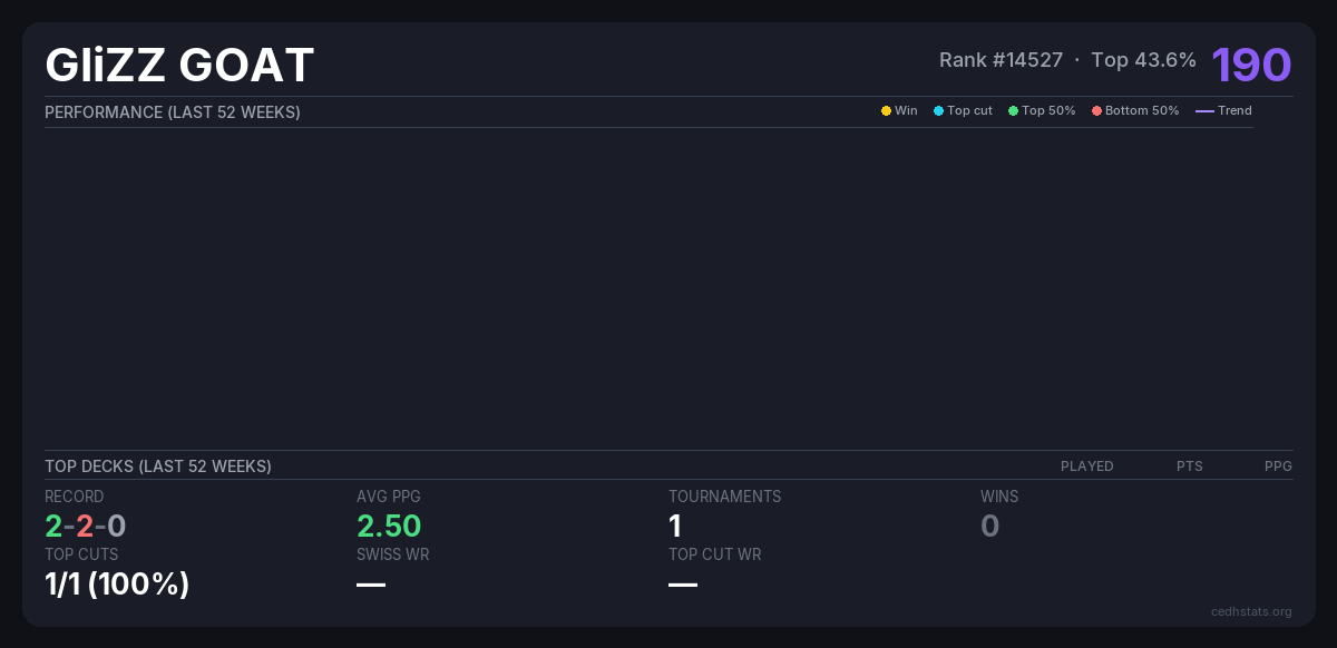 | Tournament | Deck | Result | Record | PPG | Points ? |