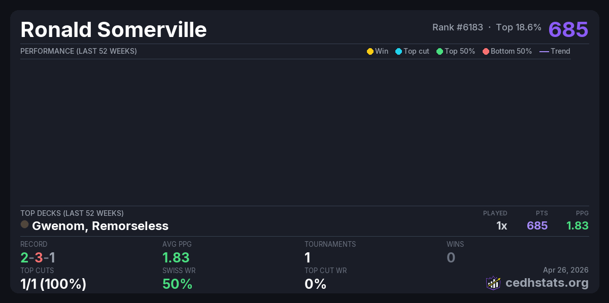 | Merlion Monthly April: Tropical Island Apr 25, 2026 · 57 players | Gwenom, Remorseless | 7/57 | 2-3-1 | 1.83 | 685 |