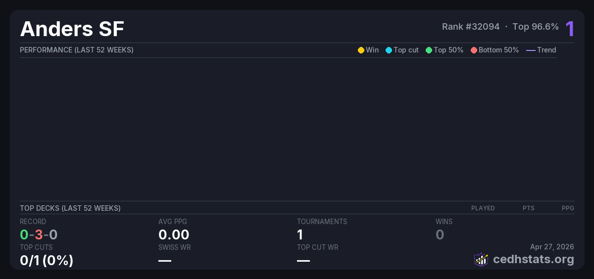 | cEDH Drammen 2025 Nov 15, 2025 | Invalid pairing | 16/16 | 0-3-0 | 1 |