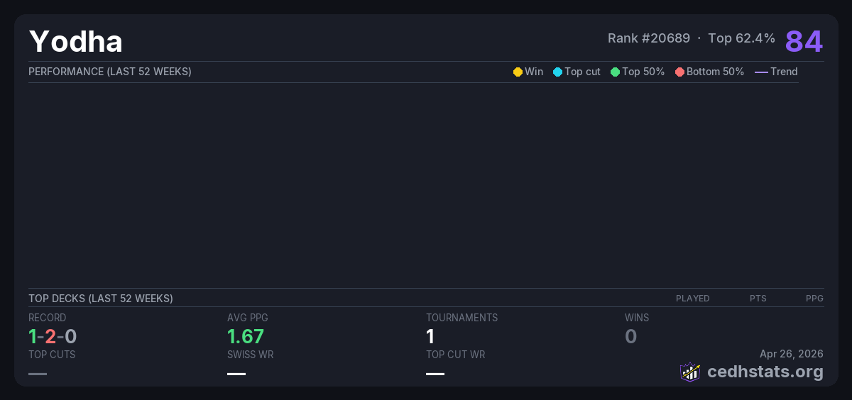 | Commander Bracket 3 @Kosa, by Play Inside Jun 14, 2025 · 16 players | Invalid pairing | 7/16 | 1-2-0 | 1.67 | 84 |