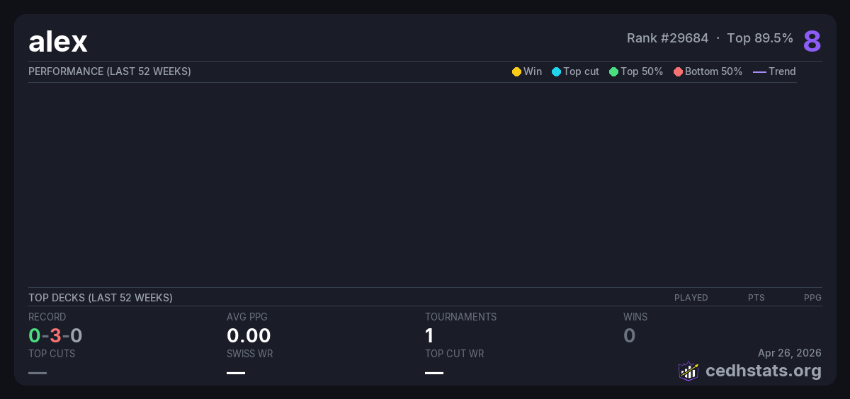 | CEDH1 Jun 02, 2025 · 16 players | Invalid pairing | 14/16 | 0-3-0 | 0.00 | 8 |