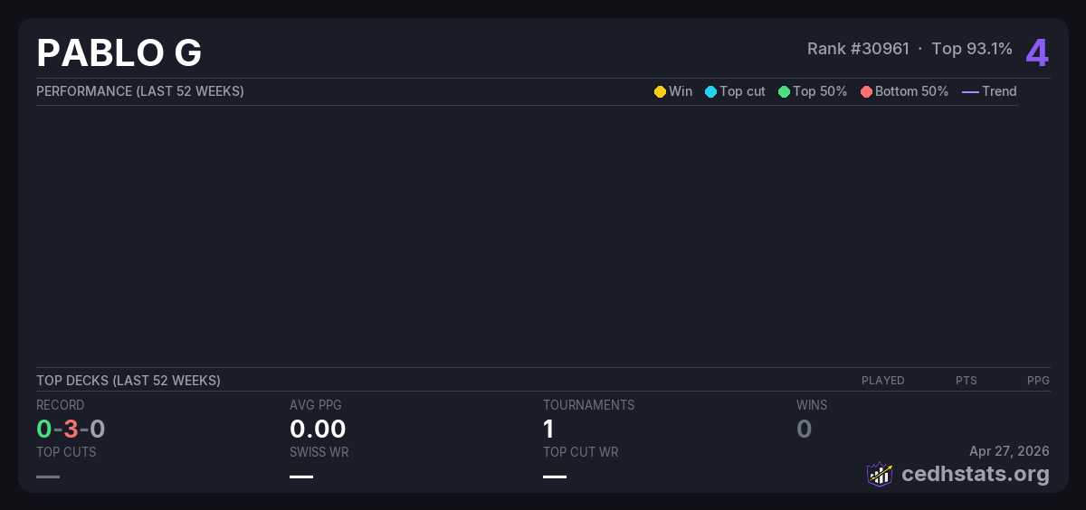 | PARA Jul 15, 2025 · 16 players | Invalid pairing | 15/16 | 0-3-0 | 0.00 | 4 |