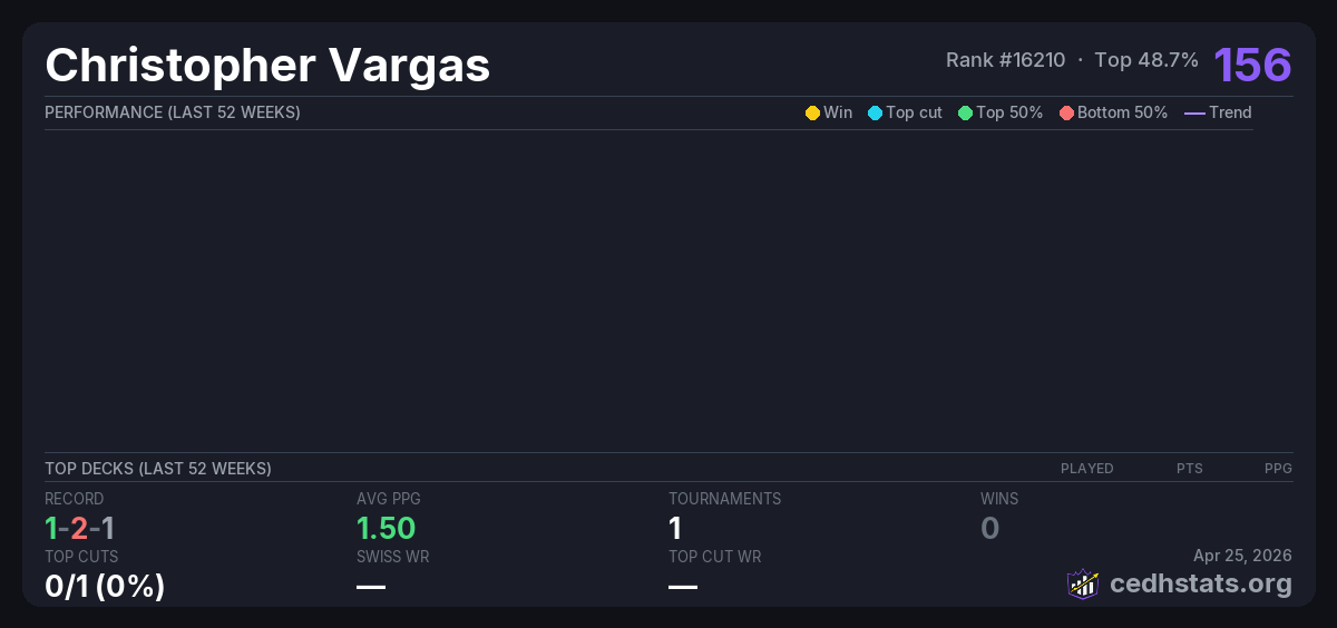 | Torneo cEDH - A Beneficio 1 Feb 21, 2026 | 5/20 | 1-2-1 | 156 | |