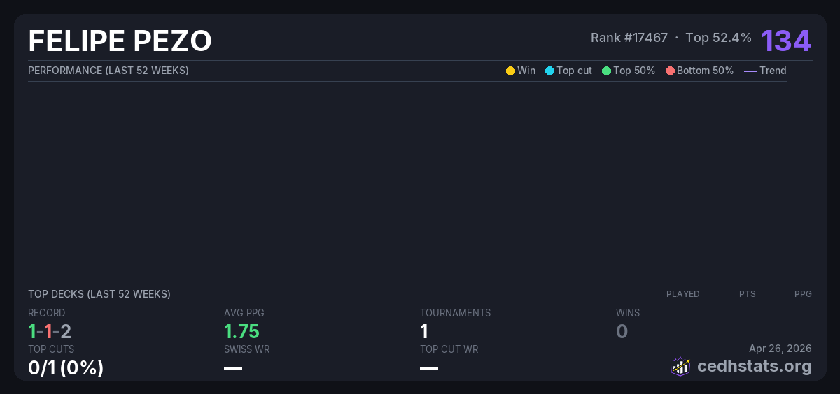 | CEDH HAMMER TCG STORE Sep 27, 2025 · 20 players | Invalid pairing | 6/20 | 1-1-2 | 1.75 | 134 |