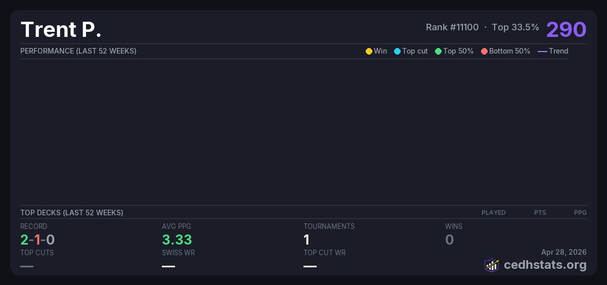 | CMFNM Aug 02, 2025 · 39 players | — | 5/39 | 2-1-0 | 3.33 | 290 |
