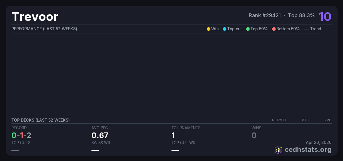 | Commander League 3 week 2 Feb 07, 2026 · 20 players | 17/20 | 0-1-2 | 0.67 | 10 |