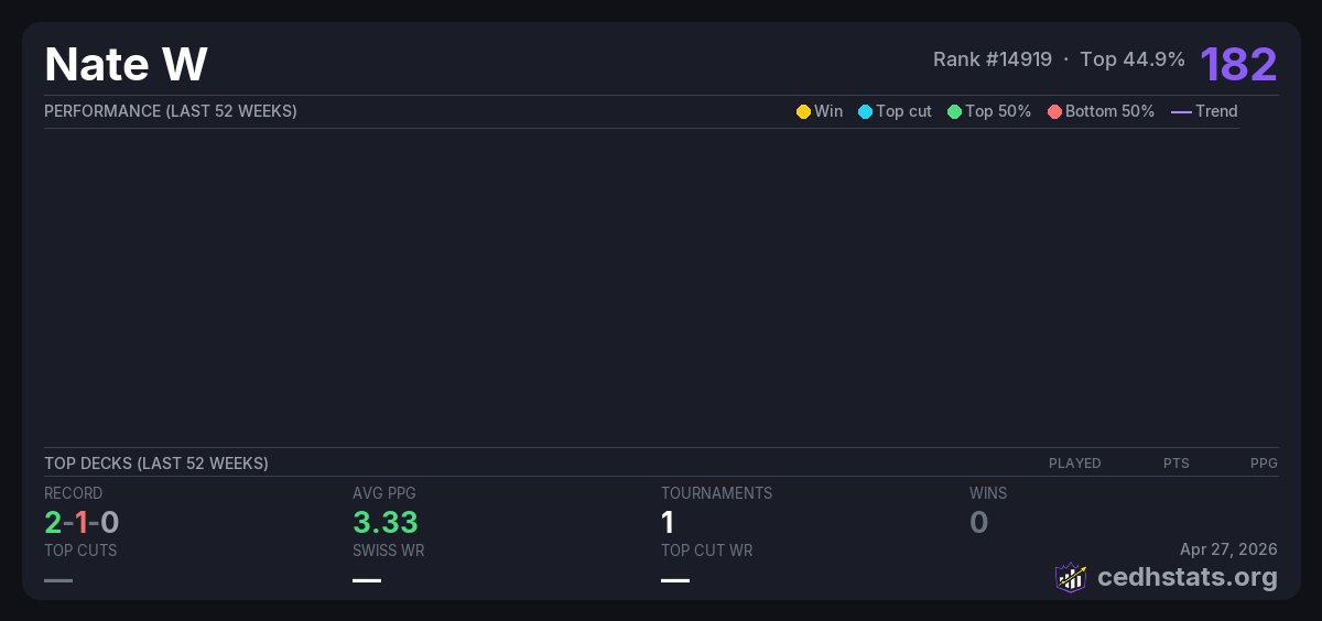 | Tournament | Deck | Result | Record | PPG | Points ? |