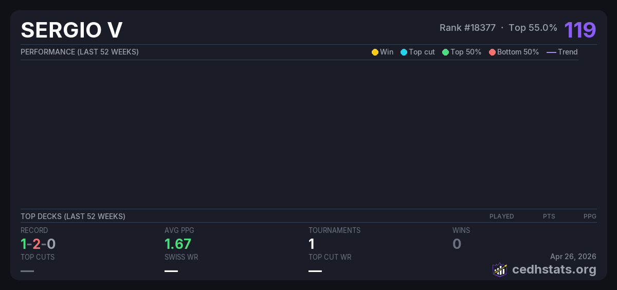 | CYDH May 22, 2025 · 20 players | Invalid pairing | 7/20 | 1-2-0 | 1.67 | 119 |