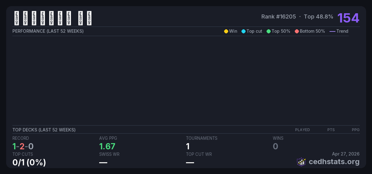 | 1月25日 CEDH月赛 Jan 25, 2026 · 28 players | 8/28 | 1-2-0 | 1.67 | 154 |