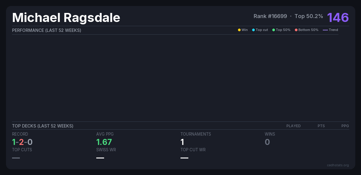 | Bracket 3 Mar 29, 2026 · 22 players | 9/22 | 1-2-0 | 1.67 | 146 |