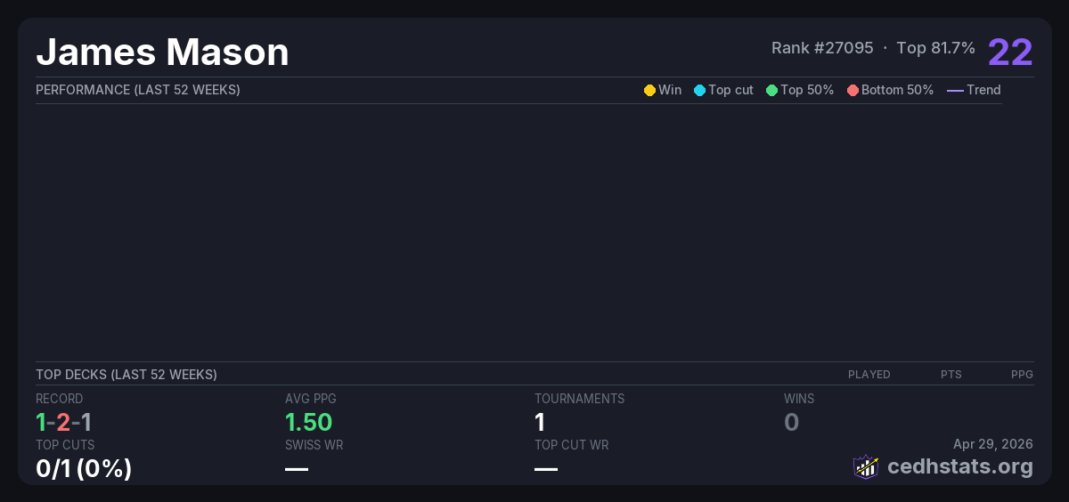 | Casual Flip Commander Jan 25, 2026 · 16 players | 12/16 | 1-2-1 | 1.50 | 22 |