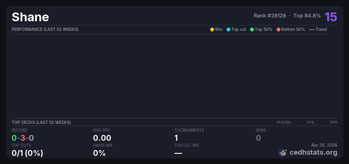 | CEDH Tournament at Collectors Connection! Apr 26, 2026 | — | 13/16 | 0-3-0 | 15 |