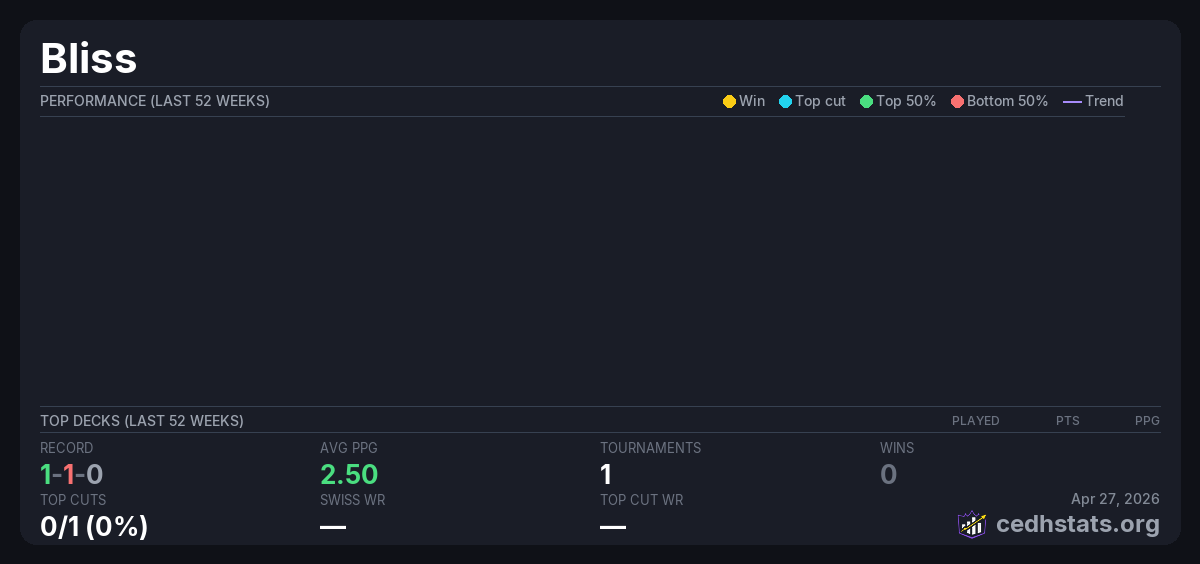 | weekly magic Apr 03, 2026 · 16 players | 5/16 | 1-1-0 | 2.50 | — |