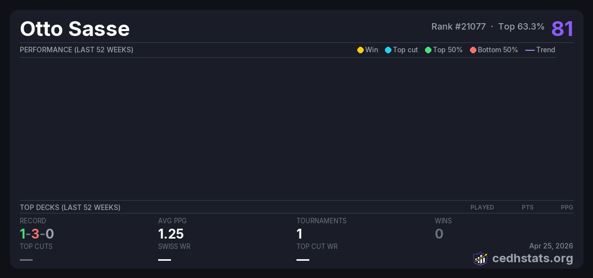 | Casa de Ruter CEDH 28/02/26 Feb 28, 2026 · 21 players | 10/21 | 1-3-0 | 1.25 | 81 |