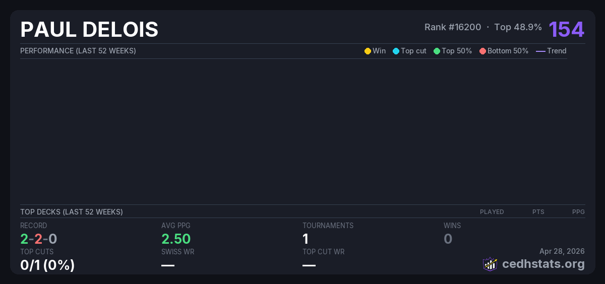 | Tournament | Deck | Result | Record | PPG | Points ? |