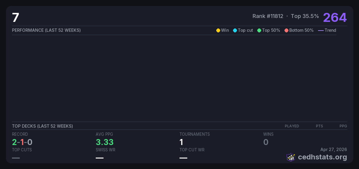 | FNM Commander @ Game On! NC Jul 18, 2025 · 32 players | Invalid pairing | 3/32 | 2-1-0 | 3.33 | 264 |