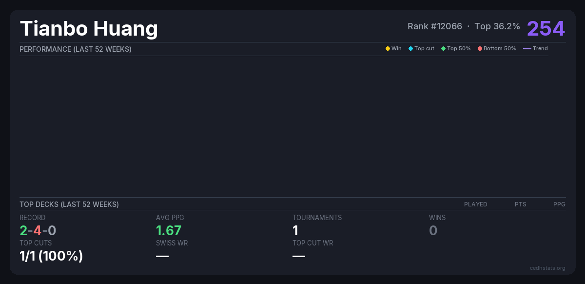 | 2025.10.25 广州CF cEDH Oct 25, 2025 · 80 players | Invalid pairing | 16/80 | 2-4-0 | 1.67 | 254 |