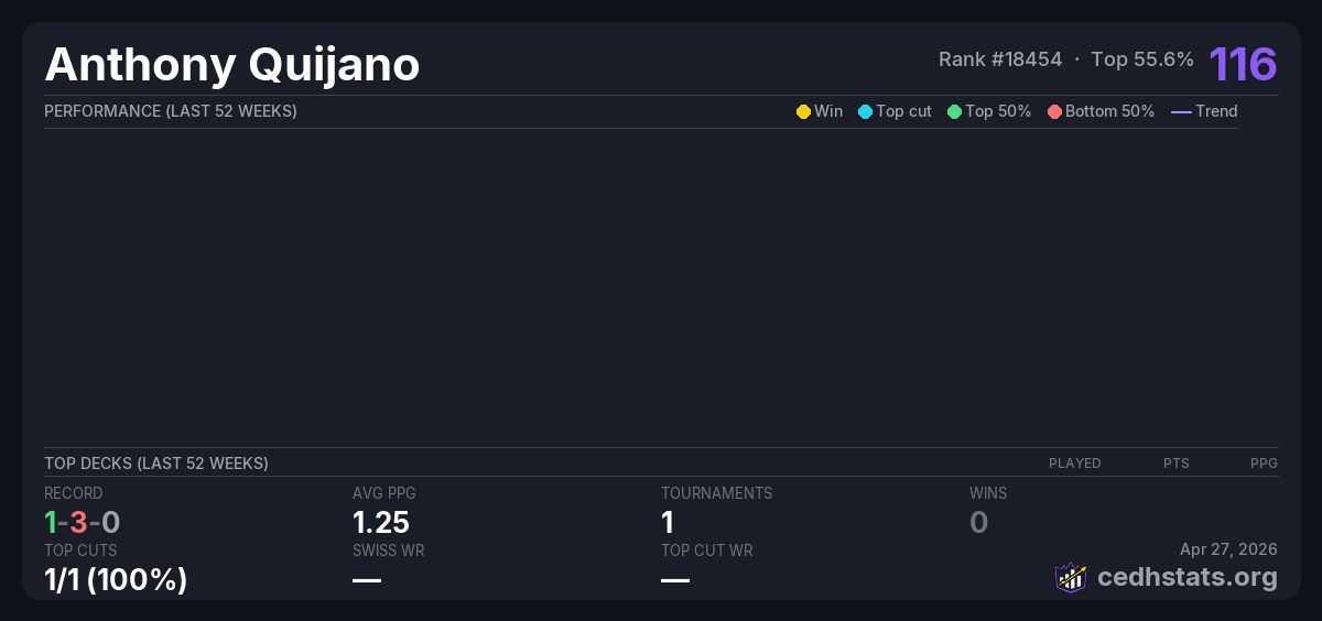 | Year End CEDH Dec 28, 2025 · 18 players | 8/18 | 1-3-0 | 1.25 | 116 |