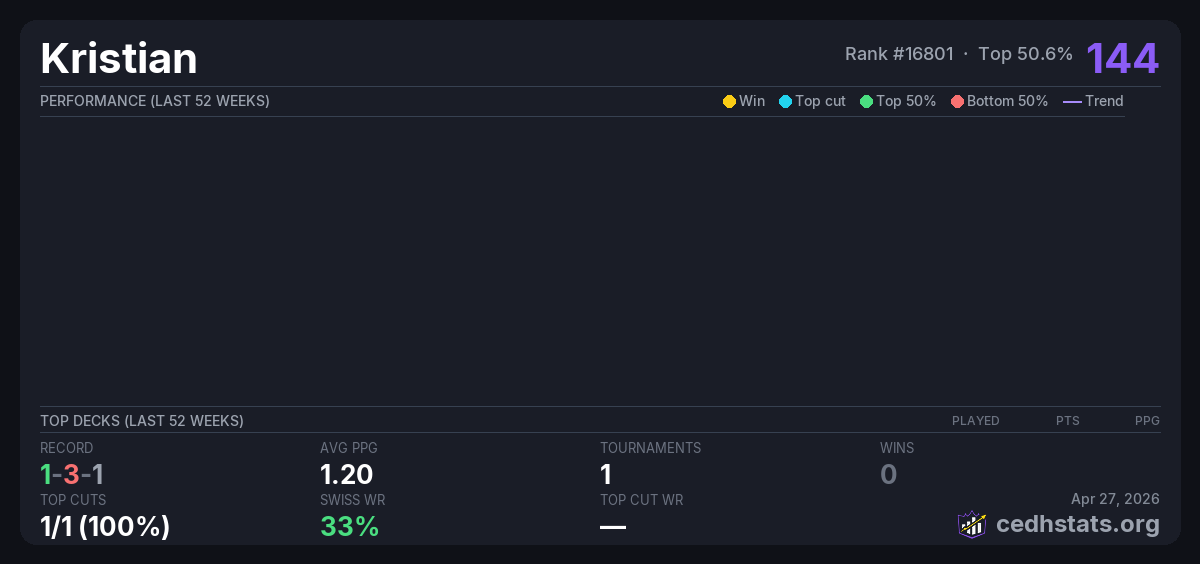 | Paragon Gaming April 25th Precon Tournament Apr 25, 2026 · 16 players | — | 4/16 | 1-3-1 | 1.20 | 144 |